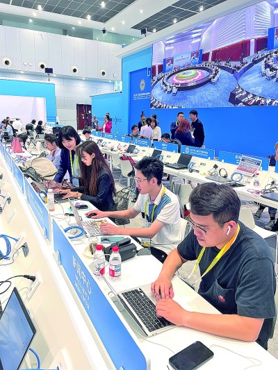 记者在新闻中心工作。本报记者 余晓葵摄/光明图片