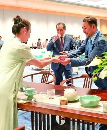 参会嘉宾在欢迎宴会前体验茶文化。新华社发